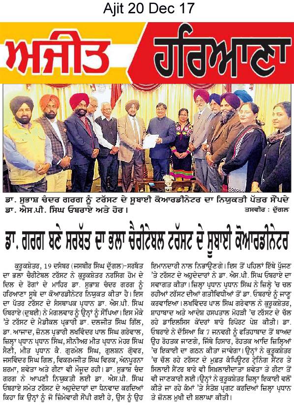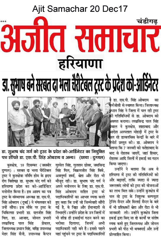 Prof ( Dr ) S P Singh Oberoi Ji appointed Dr Subhash Chander Garg Ji as SDBCT Haryana state coordinator