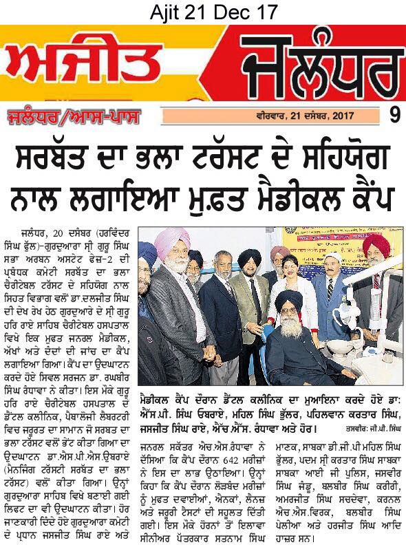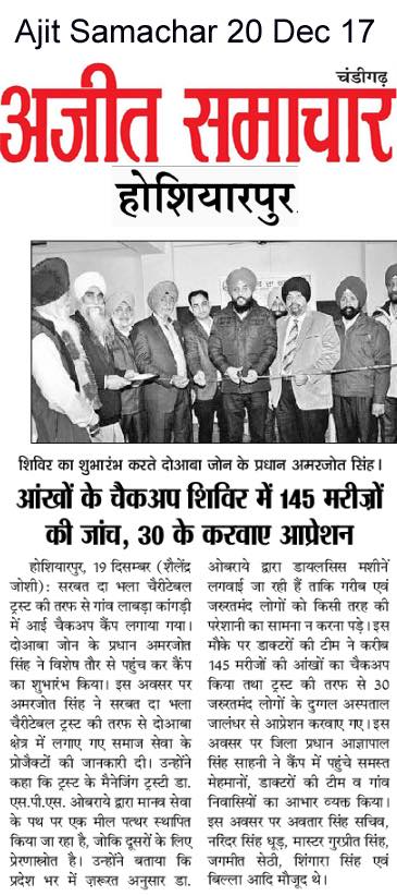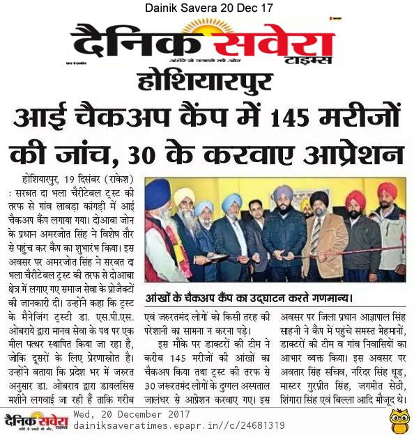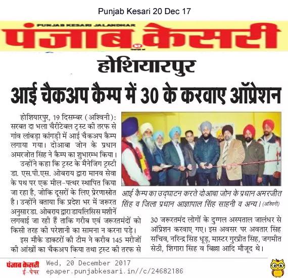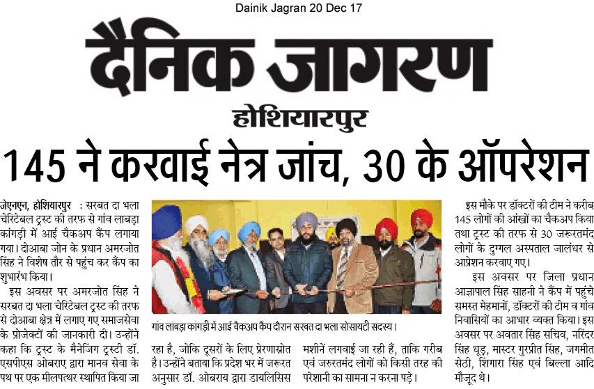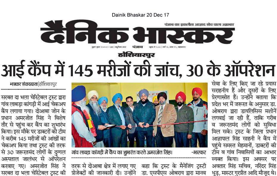 SDBCT Hoshiarpur Unit organised free eye check up & operation camp