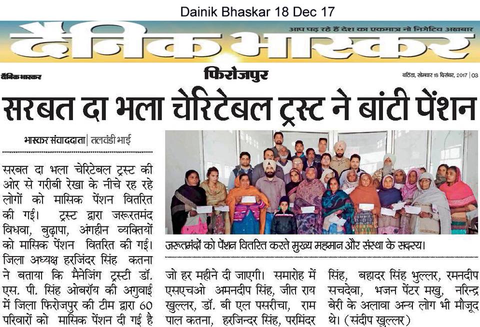 On behalf of Prof.(Dr.) S.P. Singh Oberoi Ji, SDBCT Ferozpur Unit members handed over the monthly Pension cheques to needy persons