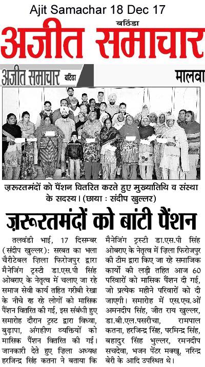 On behalf of Prof.(Dr.) S.P. Singh Oberoi Ji SDBCT Ferozpur unit members handed over the monthly Pension cheques to needy persons