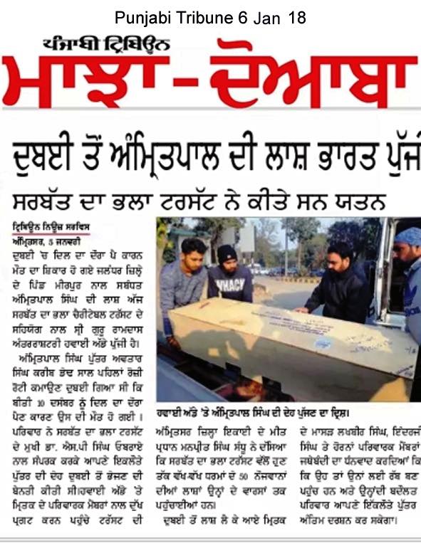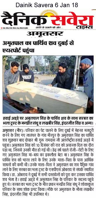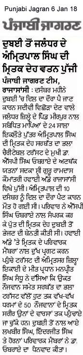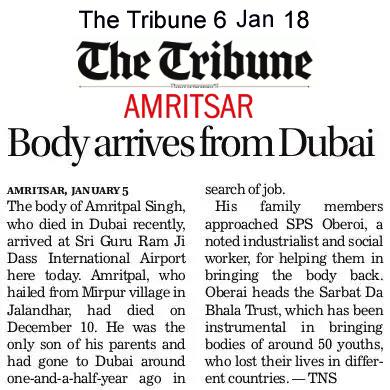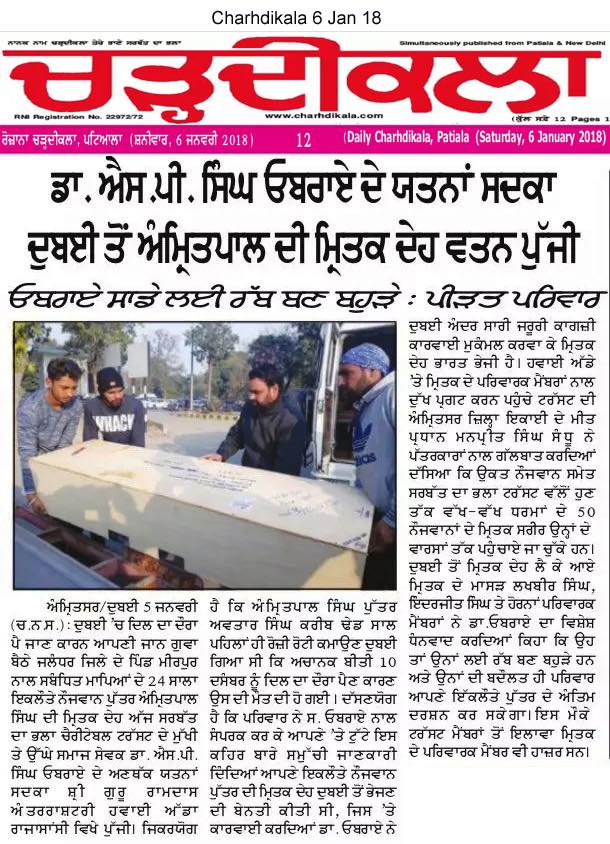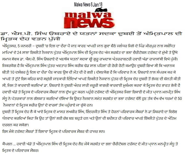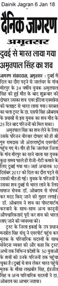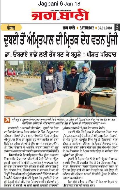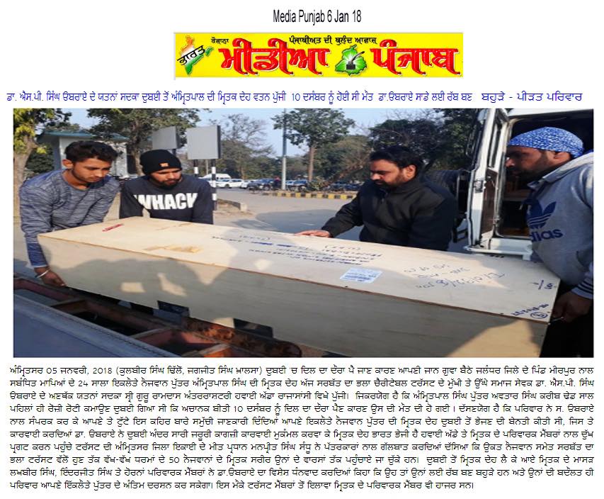 Body of late Mr. Amritpal Singh arrived from Dubai with the help of Prof.(Dr.) S.P. Singh Oberoi