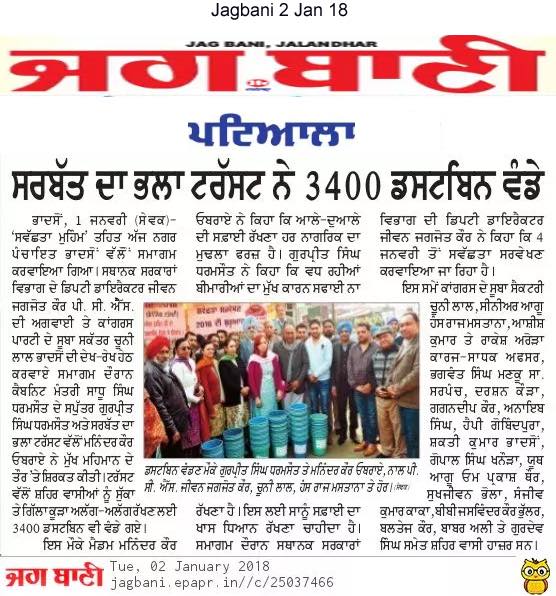 Sarbat da Bhala Charitable Trust donated 3400 dustbins under the campaign clean the city at village Bhadson district Patiala
